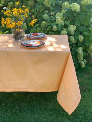 Скатерть из однотонного жаккарда медового цвета с красивой обработкой по краю, которые в своем тандеме создают потрясающий внешний вид и отменное качество. Она выигрышно смотрится в любом интерьере, поэтому с такой скатертью комната заиграет новыми красками, а хозяева слывут людьми с отменным вкусом.